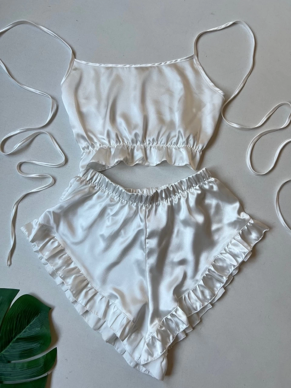 Ekru Fırfırlı Sırt Dekolteli Pijama Takımı
