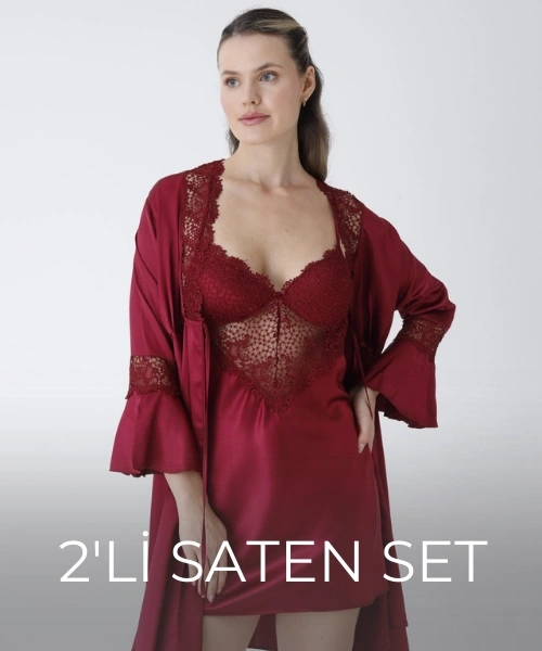 Bordo Güpür Detaylı 6 Parça Uzun Saten Gecelik Sabahlık Seti