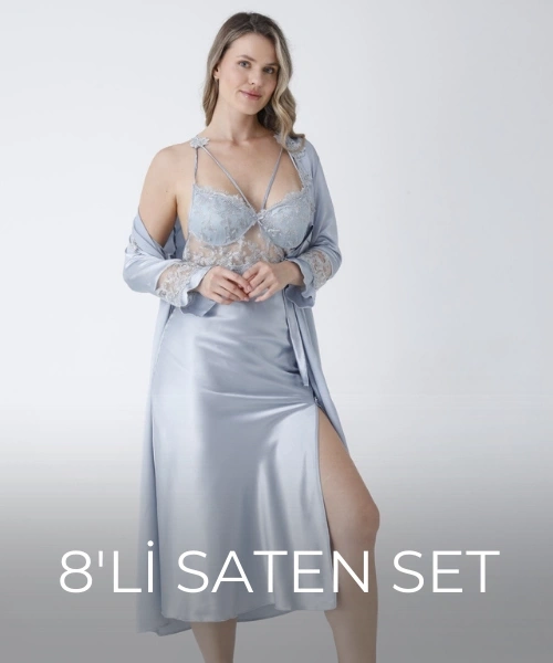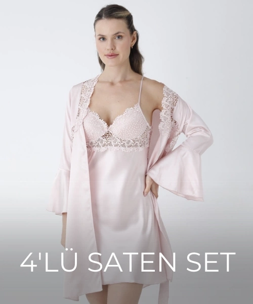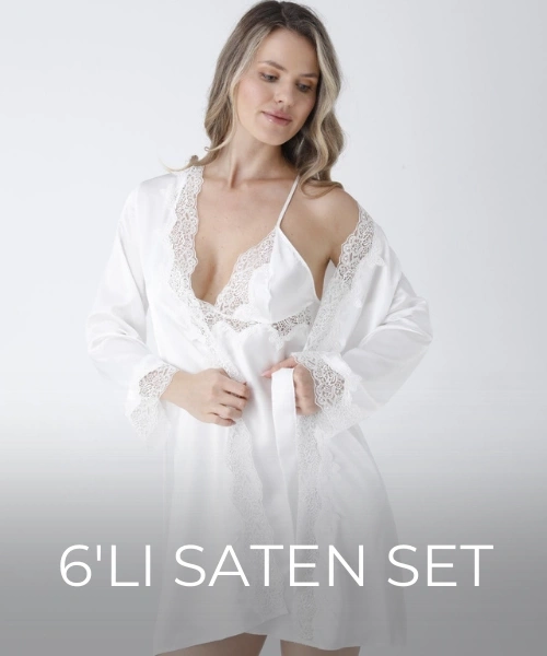 Ekru Güpür Detaylı 6'lı Saten Gecelik Sabahlık Set