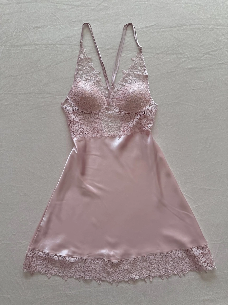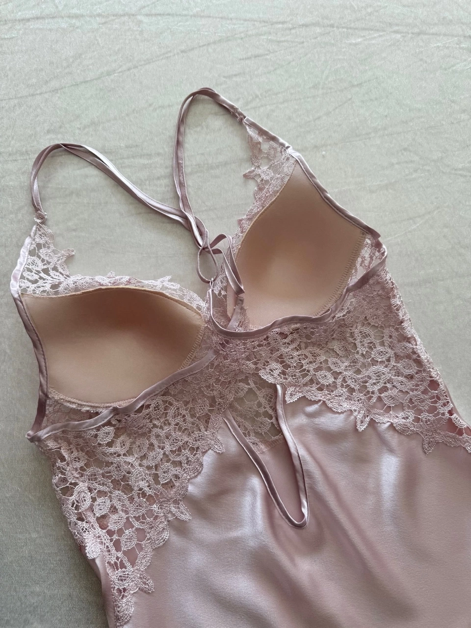 Pudra Kısa Güpür Detaylı Gecelik Sabahlık Pijama Seti