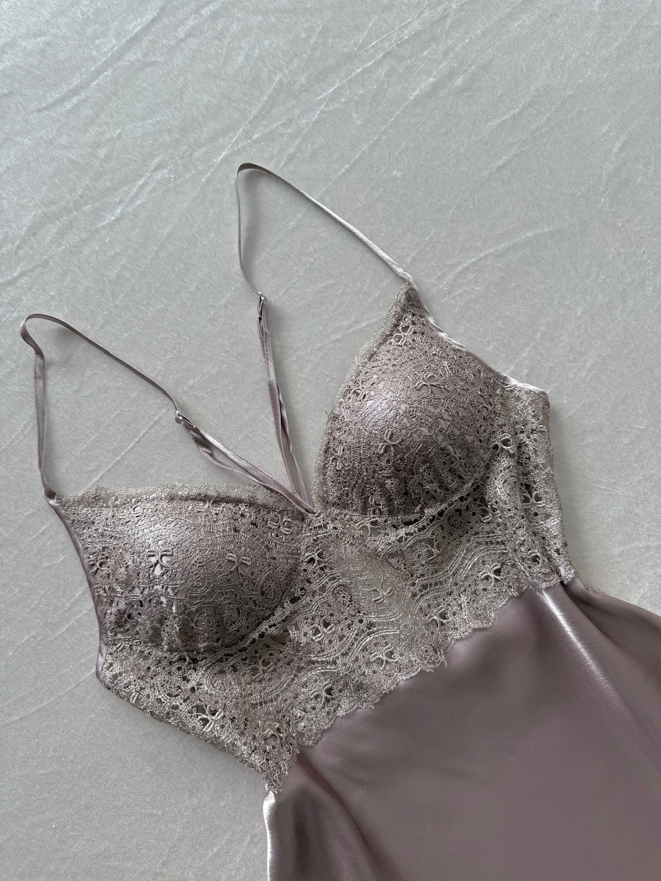 Ekru Uzun Yırtmaç Detaylı Gecelik