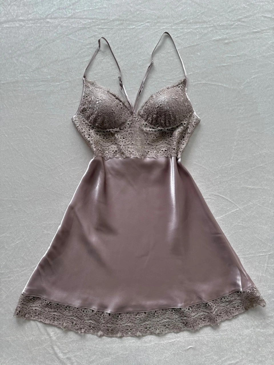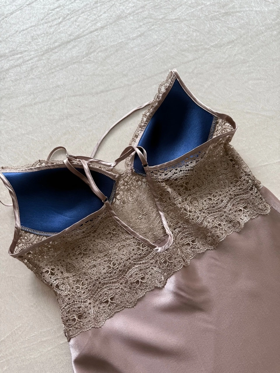 Pudra Kısa Güpür Detaylı Gecelik Sabahlık Pijama Seti